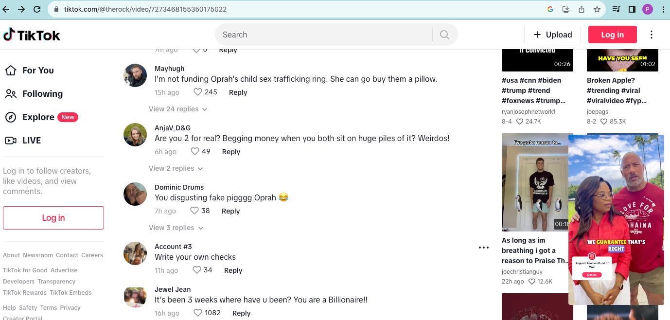 Obviously, I don't have answers, but I'm just wondering if "land grab" is hyphenated? We know the greedy vultures that descended upon Florida within days of a hurricane disaster. It is not difficult to imagine that such will be the case for Maui and Lahaina. There is little to offer as a silver lining to this unimaginable situation, but perhaps there is a small one. Just a day ago, a TikTok video of The Rock and Oprah went viral where they were sharing a platform they created to collect donations. What is incredibly interesting is that despite being watched by over 440K, not much had been donated. Most telling, however, are the comments on the video. Here are some of the most sanitized ones (Click on the screenshot to access the video):
