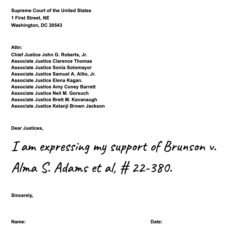 1) Mail a letter to SCOTUS. All you need to do is write “I support Brunson v. Alma Adams et al”. Add a personal postscript. Handwritten is best, personalization is extremely meaningful and adds gravitas to your letter. Have your kids and grandkids send a letter as well. Ask them to draw a picture or decorate with stickers!